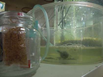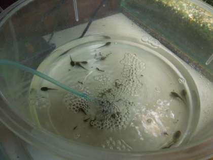 水そうの中をのぞくと、オタマジャクシがいました。司書の先生が、餌にかつお節を持ってきてくださいました。