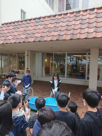 宿に着いて、早速、魚つかみ体験をしました。つかんだ、タイ、シマアジ、タコを夕食の食事に出していただきます。