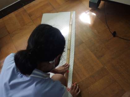トートバックを作ります。今日は、ミシンで縫うところに印をつけました。楽しく、意欲的に活動しています。