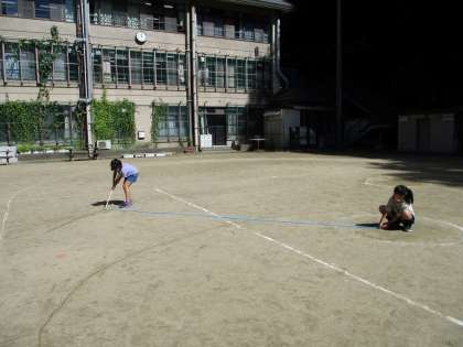 コンパスで、半径3cmの円をかき、「直径」や「中心」について学習しました。また、コンパスが使えない半径5mの円はどうやってかくかを考え、運動場で協力して描いてみました。次は、「球」についても学習していきます。