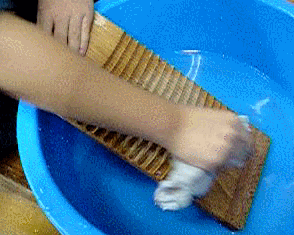 せんたくをタライとせんたく板を使ってしました。汚れのある部分を、せんたく板の面にこすりつけてきれいにしていきます。力をつかうので、大変ですね。