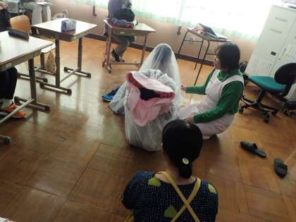 また赤ちゃん(人形)を抱いたり、大きな子宮の袋に入り生まれる経験をしたり、出産を手伝う疑似経験をしたりしました。