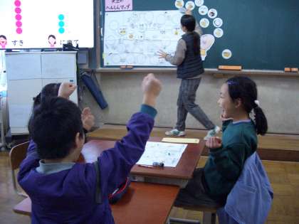 今日は、栄養教諭の先生に大豆がどのような食品として流通しているのか、クイズやイラストで分かりやすく教えてくださいました。