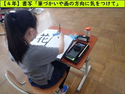 4月17日(水)4年生は、書写の時間に筆づかいと画の方向に気をつけて「花」という字を書きました。