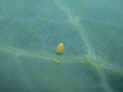 キャベツの葉についたモンシロチョウの卵を見つけた子ども達は、歓声を上げていました。