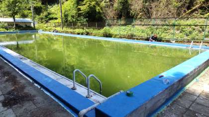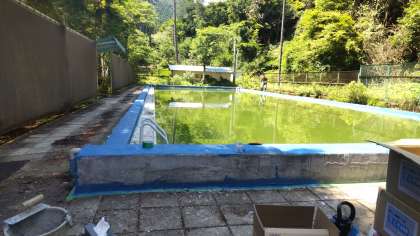 緑に包まれた鞍馬小学校のプールに、青色の塗料が映えてとてもきれいです。
