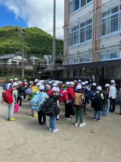 いよいよ花背山の家の宿泊学習が始まります。これは、出発式の様子です。三日間のみんなで頑張ろうという気持ちを高めました。