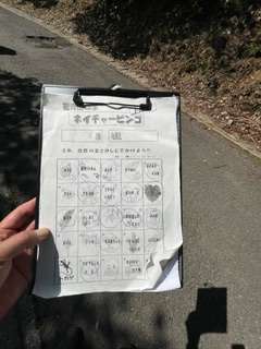 ネイチャービンゴの様子です。見たり聞いたり触ったりしながら、山の家の自然を楽しみました。