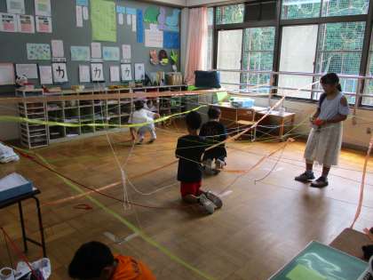 教室の様々なところにひもをつなぐ活動をしました。