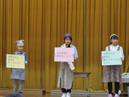 今日は学習発表会。3年生は社会科「商店のはたらき」で学習したことを劇やクイズのような形で発表しました。スーパーに社会見学に行って見つけた工夫をわかりやすく伝えることができました。