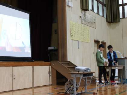 今日は学習発表会。6年生は算数科「円の面積」の公式について説明しました。たくさんの学年の子どもたちに活動してもらいながら、なぜ円の面積の公式が「半径×半径×円周率」になるのかを分かりやすく伝えることができました。