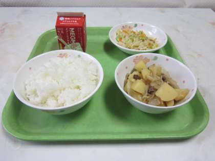今日の給食は,ごはん,にくじゃが,ごまずに,ぎゅうにゅうでした。