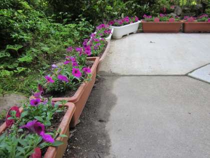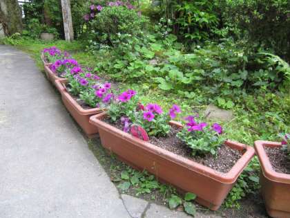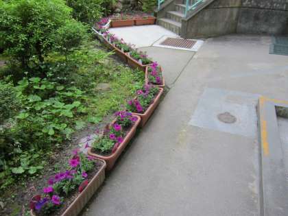 管理用務員が,プランターに土を入れ,たくさんの花を植えて通路にならべました。