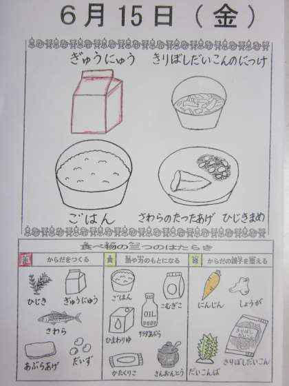 今日の給食献立は,さわらのたつたあげ,ひじきまめ,きりぼしだいこんのにつけ,ごはん,ぎゅうにゅうでした。