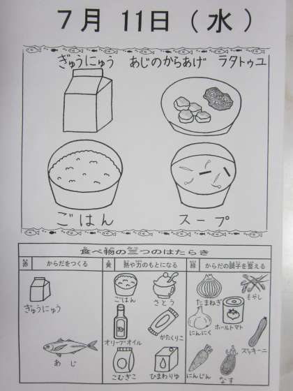 今日の給食献立は,ごはん,スープ,あじのからあげ,ラタトゥユ,ぎゅうにゅうでした。