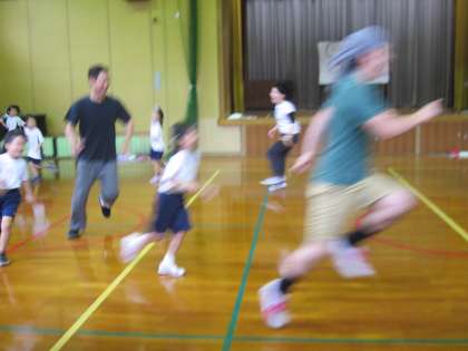 体を動かして体操したり,おにごっこをしたり,歌の練習,セリフの練習をしました。元気な劇団の方がいろいろ教えてくれました。