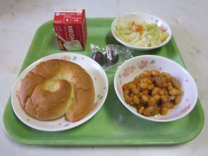 今日の給食献立は,バターうずまきパン,ポークビーンズ,やさいのホットマリネ,ぶどう,ぎゅうにゅうでした。