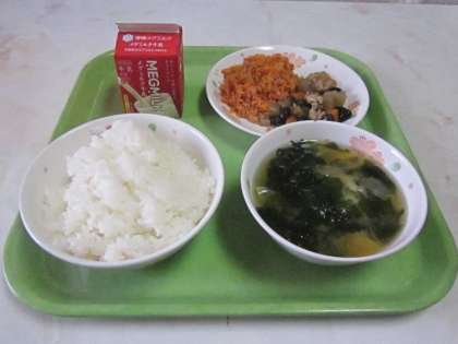 今日の給食献立は,ごはん,みそしる,うめさけごはんのぐ,くろまめのごもくに,ぎゅうにゅうでした。