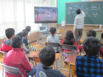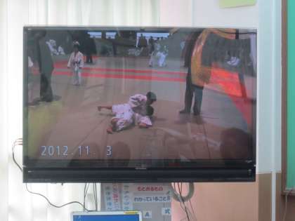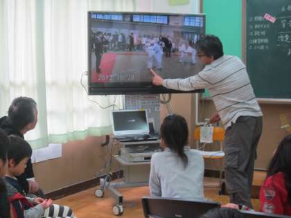 学童柔道大会の試合のDVDをみんなで見て,柴田先生にいろいろと柔道のことを教えていただきました。