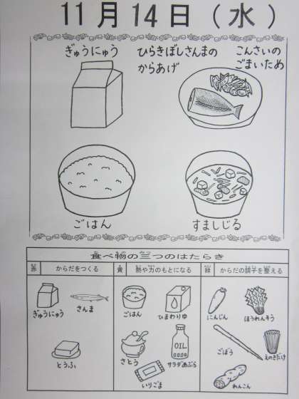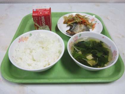 今日の給食献立は,ごはん,すましじる,ひらきぼしさんまのからあげ,こんさいのごまいため,ぎゅうにゅうでした。