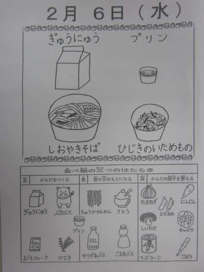 今日の給食献立は,しおやきそば,ひじきのいためもの,プリン,ぎゅうにゅうでした。