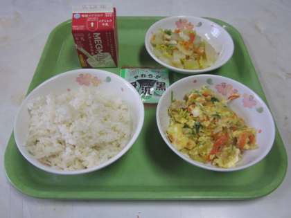今日の給食献立は,はいがまいごはん,おやこに,はくさいのにつけ,くろだいず,ぎゅうにゅうでした。