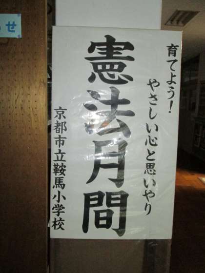 今日から5月です。そして明後日,5月3日(祝)は憲法記念日です。昭和22年5月に現在の「日本国憲法」が施行されたことにちなんで,5月は『憲法月間』と制定されました。今日の朝会では,図書室にあった本を手がかりにして,『昔は日本をはじめいろんなところで戦争があったこと,多くの人々が命を失ったり悲しい思いをしたこと,日本も70年ほど前の戦争で,二度と戦争を繰り返すことがないように憲法が制定されたこと』等を話しました。子どもたちは皆真剣に聞いていました。特に歩道橋の『のぼり』に書かれてある『笑顔・あたたかい心・励まし合う』といった言葉の中にも,憲法の精神が含まれることを伝えました。憲法月間の今,ご家庭におかれましても,身近な(人権)について考え,話し合う時間をとっていただければと願っています。