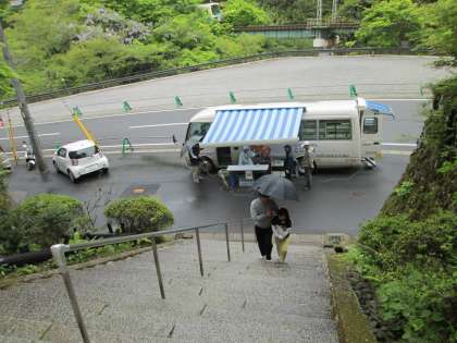 移動図書館『こじか号』がやってきました。今日は雨模様だったこともあり.子どもたちと行きました。係の方に少し説明をいただき,興味深く中をのぞかせていただきました。