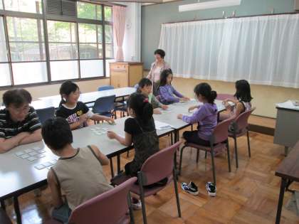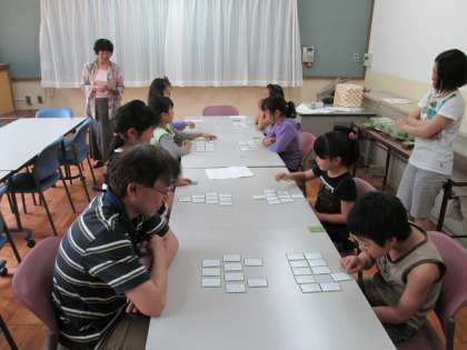 百人一首教室の様子です。指導の先生のかけ声で,みんな熱心に取り組んでいます。札によっては,上の句を聞いただけで札をとれていました。札には色のシールが貼られ,効果的に活用されています。