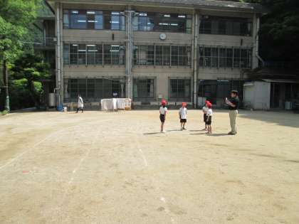 体育の授業前には,怪我をしないよう準備運動をします。2年生は鉄棒運動の前に,手足をしっかり伸ばしていました。その横で,保健室の馬場先生が布団など日光消毒してくださっていました。