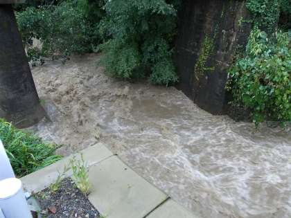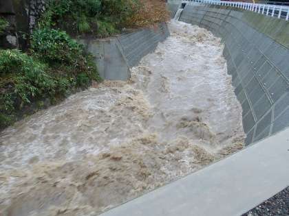 写真のように川は激しい流れになっています。倒木等は現在のところありませんが,十分に気をつけてください。