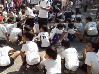 800m走はサブグラウンドで行われました。写真は招集の様子です。79-1のゼッケンが本校児童です。走った後の感想は,「(専用のトラックなので)走りやすかった!!学校もこういうトラックにしたら?」と話してくれました。