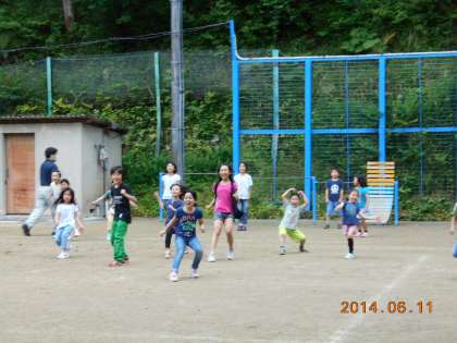 ランニングのあとは,みんなで遊びます。今日は,全校で「だるまさんがころんだ」でした。
