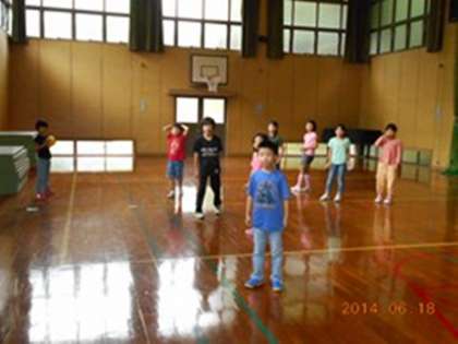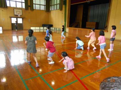 写真上:3年生と4年生がパスゲームを始めました。しばらくすると,1年生がやってきたので,「あれっ?」という表情でゲームが止まります。