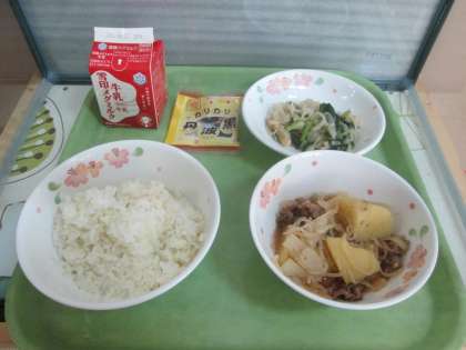 今日の給食は麦ごはん・牛乳・肉じゃが・