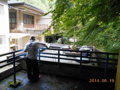 夏休み中は校内を修繕したり,教具を整理したり,普段できないことを行っています。今年は,便所棟の雨漏りを直しています。専門業者が防水工事を施工しています。