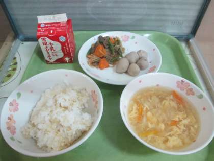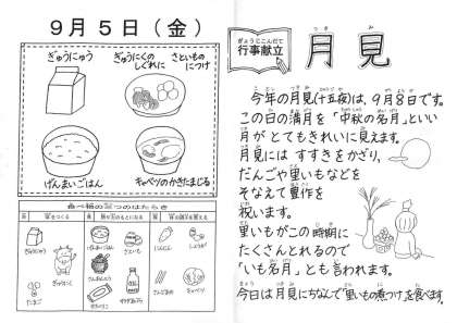今日の給食は玄米ご飯・牛乳・牛肉のしぐれ煮・里いもの煮つけ・キャベツのかきたま汁です。9月8日(月)の十五夜(満月)をイメージしています。
