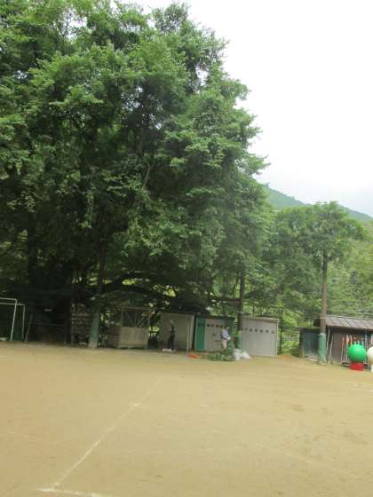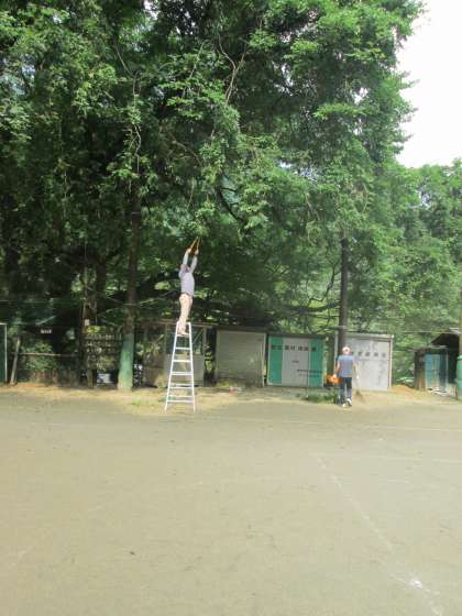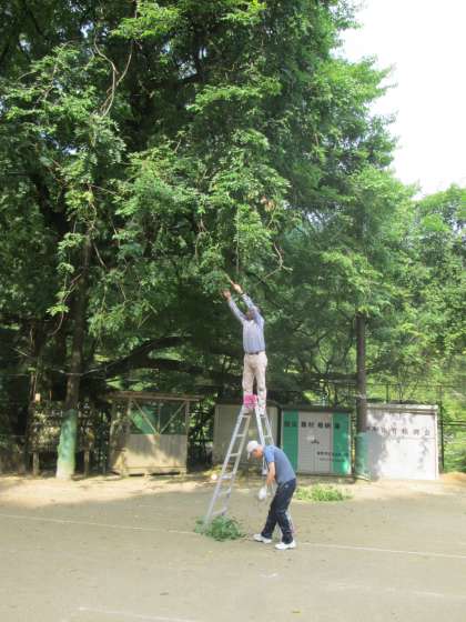 校庭の‘ムクの木’がかなり垂れ下がってきました。つるが負担をかけているのかもしれませんね。教頭先生・管理用務員さんに剪定をお願いしました。