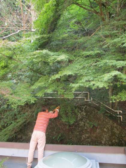 管理用務員さんが,校舎に向かって伸びている樹木の剪定をしています。校舎の‘とゆ’や各屋上の‘排水口’に,落ち葉や小枝が詰まらないようにしています。