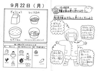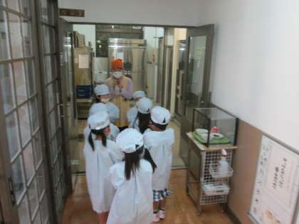 今日の給食は,麦ごはん・牛乳・鶏肉と野菜の煮つけ・ひじき豆です。食物繊維が多いです。しっかり噛みましょう。