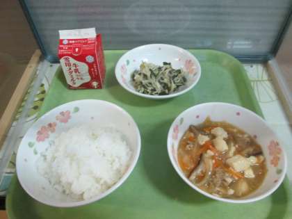 今日のメニューは,ごはん・牛乳・五目どうふ・切干大根のいためナムルです。