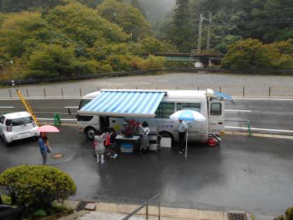 移動図書館がやってきました。雨の日も,横にテントがあるので大丈夫です。