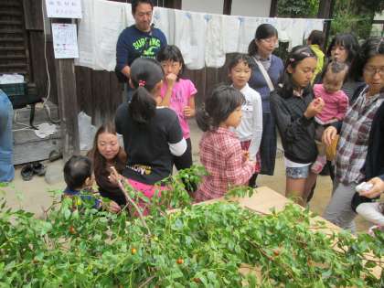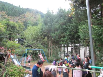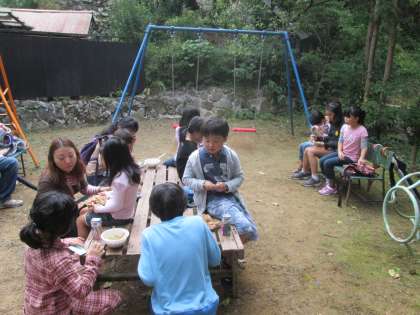 作品が完成した鞍馬っ子は,おいしい食べ物を,おなか一杯いただきました。(サプライズの“ナツメの実”もありました。)また,この日に間に合うように〖ブランコ修理〗もしていただきました。今日は楽しい一日をありがとうございました。
