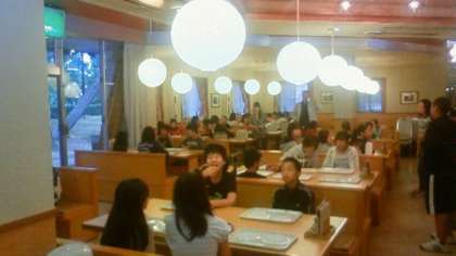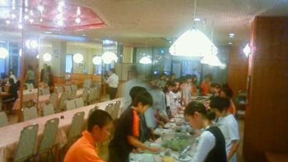 朝食はバイキングで,ご飯かパンか、味噌汁をいただくか迷っているようです。