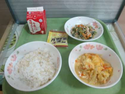 今日の給食は,玄米ごはん・牛乳・親子煮・もやしの煮びたし・まめ(丹波黒)です。歯応えを感じていただきましょう。
