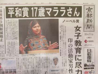 ノーベル平和賞を受賞されたマララさん(17歳)のお話を,新聞の記事からしました。世界中のすべての女性が教育を受ける権利があること,平和を訴える活動を続けられたことなどを交えながら,