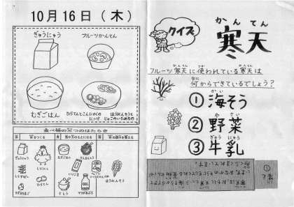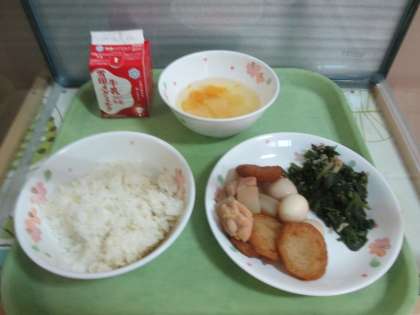 今日の給食は,麦ごはん・牛乳・平天とこんにゃくの煮つけ・ほうれん草とじゃこのいためもの・フルーツ寒天です。平天,児童に人気のようです。