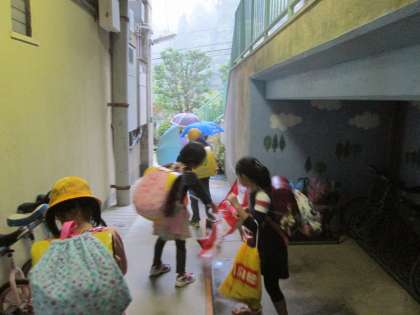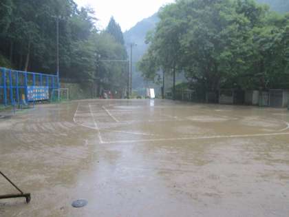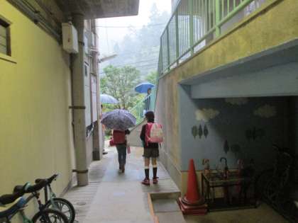 雨がだんだん強く降ってくる中,鞍馬っ子たちは下校します。運動場も一面池のようです。