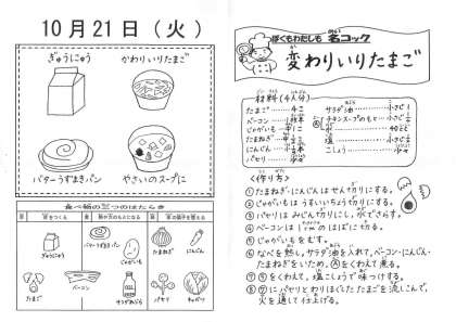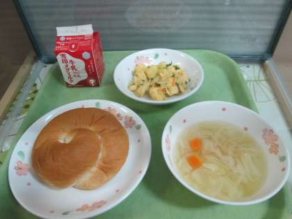 今日の給食は,バターうずまきパン・牛乳・変わりいり卵・野菜のスープ煮です。温かいスープはこれからの季節に嬉しいですね。