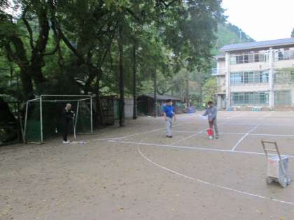 教頭先生・教務主任で,図面を頼りに運動場に白線を引いています。二人の連携で,臨時の駐車場の完成です。